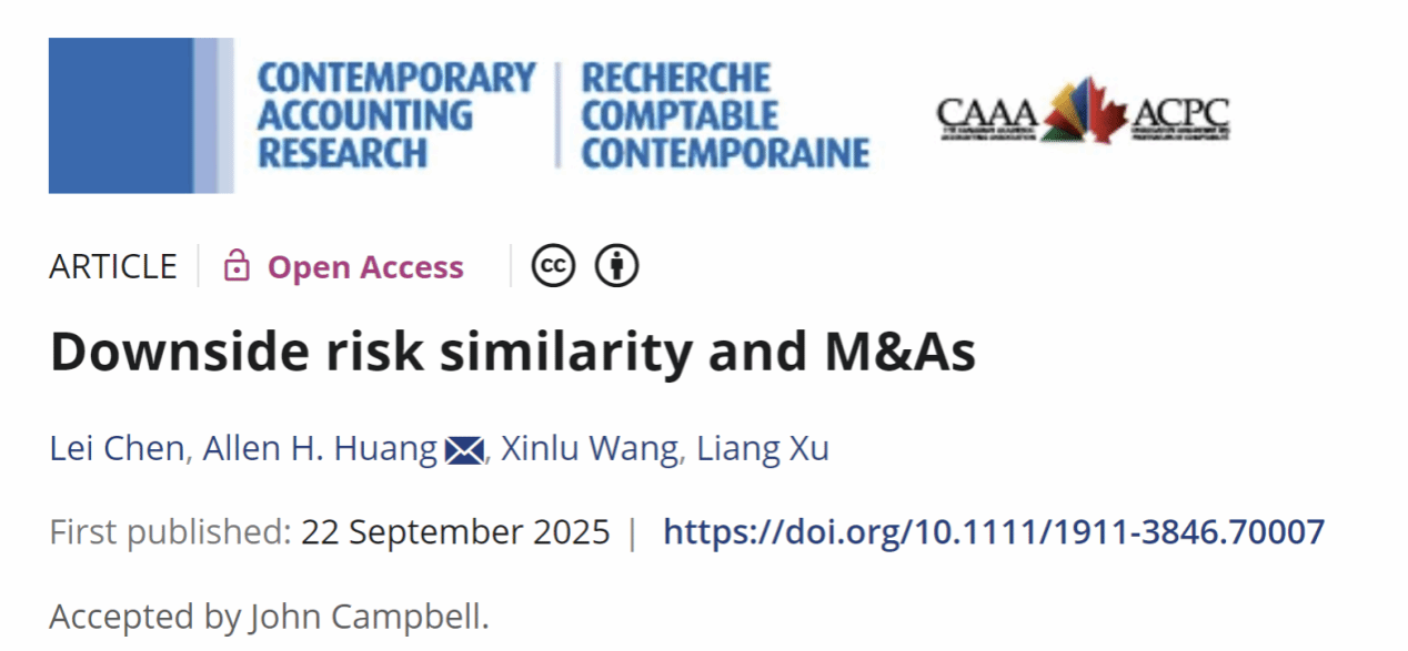公司陈磊教授与合作者的论文《Downside risk similarity and M&As》在国际会计学顶刊Contemporary Accounting Research正式线上发表。