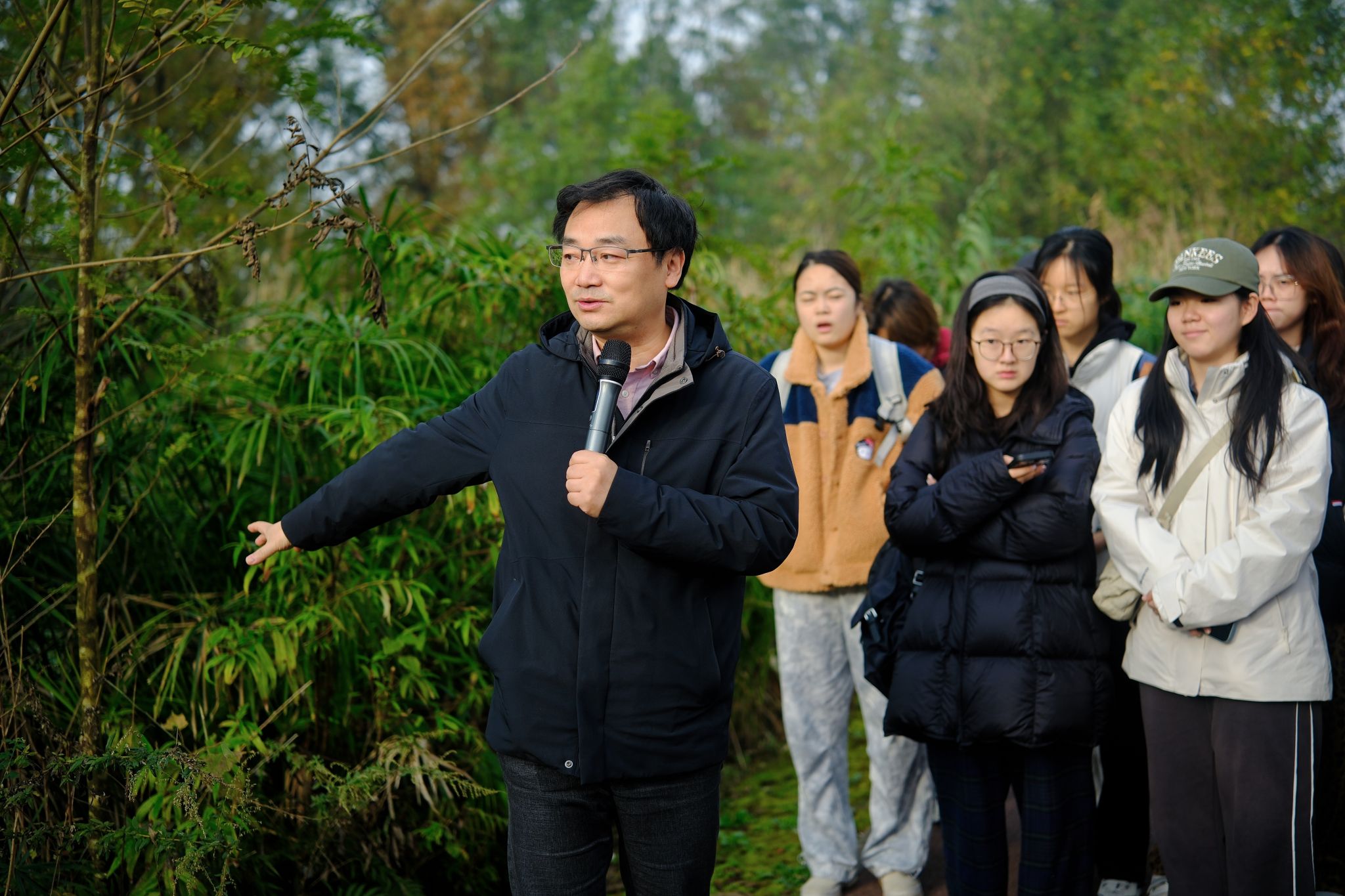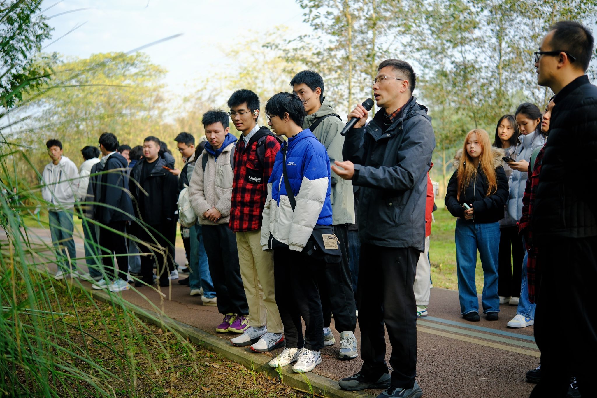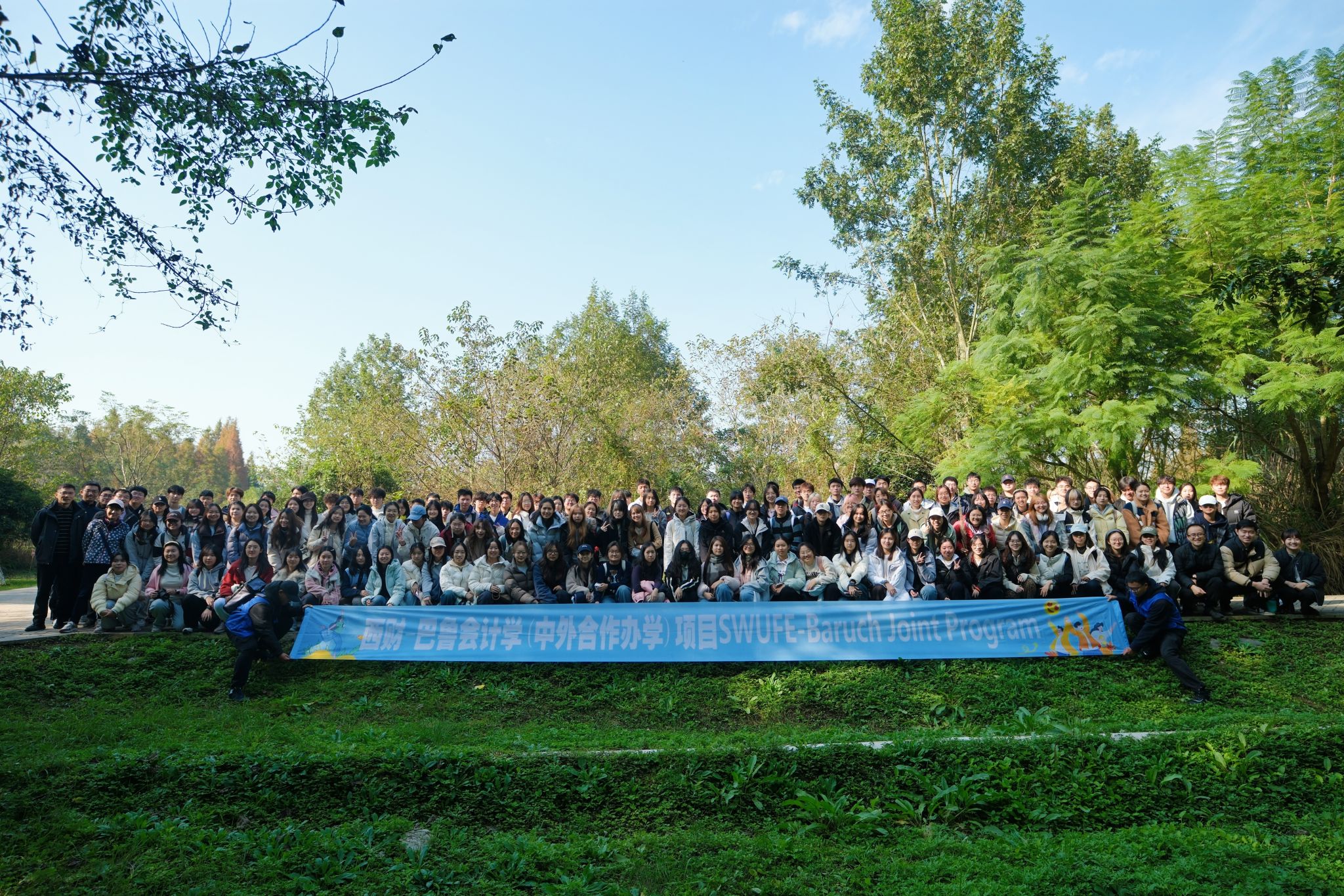 11月23日,项目特邀四川省林草局野生动物保护站副站长唐荣华作为特约带队教师,与《环境生态学》课程特聘教师高辉副教授、谢嘉穗副教授,辅导员徐天然老师及项目办公室郝若欣老师、罗瀚林老师一同带领2025级会计学(中外合作办学)全体148名同学奔赴崇州市五星村桤木河生态湿地公园,开启了一场融理论、实践与协作为一体的沉浸式秋日研学。作为项目的特色课程,也是纽约城市大学巴鲁公司要求的自然科学类必修课程,《环境生态学》一贯倡导“理论联系实际,学以致用”的学习理念。此次户外教学正是该理念的生动体现,旨在引导同学们走出课堂,在真实的生态场景中深化理解、激发思考。