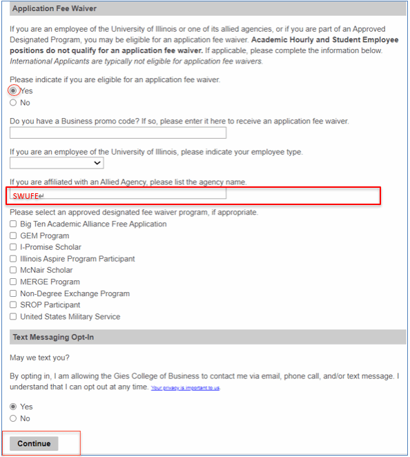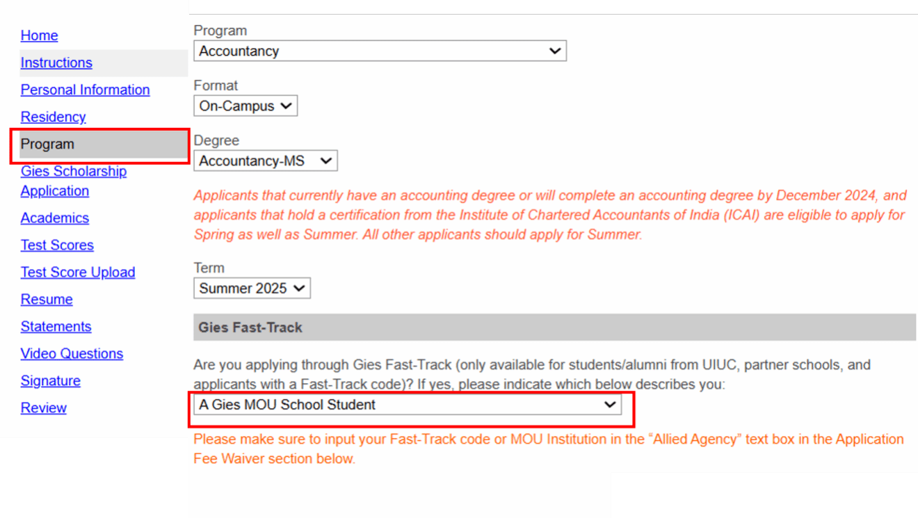 1.同时满足四项申请要求的申请人请在2025年1月15日前登录choose.illinois.edu/apply完成申请--并在“Program”目录中选择“Summer 2025”及“A Gies MOU Schools Students”, 在“Application Fee Waiver“下选择“Yes”,在“if you are affiliated with an Allied Agency, please list the agency name.”下填写“SWUFE”;