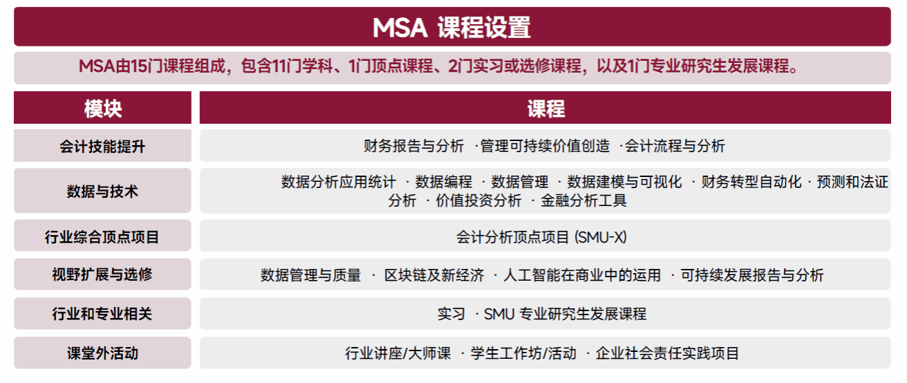 本项目提供亚洲首个会计类数据分析方向的专业硕士学位。与其它类分析课程不同,MSA 课程不仅立足于“数据”和“分析”两方面内容,而且还覆盖了数字技术在会计领域应用的深层研究与探索。