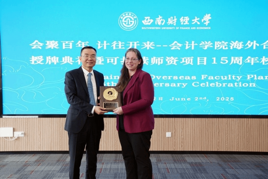 On the morning of June 2, the delegation participated in the "Assembling for a Century, Counting for the Future: Awarding Ceremony for Overseas Partners of the School of Accounting and the 15th Anniversary Celebration of the Sustainable Overseas Faculty Plan." The ceremony was attended by Ma Yongqiang, a Member of the Standing Committee of the CPC Committee and Vice President of SWUFE, Huang Haibo, Director of the Human Resource Department, Tan Hongtao, Director of the Audit Department, Wang Yeting, Director of the Office of International Exchange and Cooperation, SOA's leadership team, and more than 20 faculty representatives from the Sustainable Overseas Faculty Plan. Vice President Ma Yongqiang, Vice President Mary Gorman, Director Suresh Govindaraj, and Professor YE Jianming each delivered speeches, reviewing the development of the Sustainable Overseas Faculty Plan since its launch in 2010. Over the past fifteen years, the program has selected more than 80 outstanding SWUFE students to pursue doctoral studies abroad in fields such as finance, accounting, and accounting information systems (AIS). Upon completing their studies, many have returned to SWUFE, emerging as promising scholars and key educators who have contributed to the university’s academic development with their international, cross-cultural perspectives. Ma Yongqiang awarded the commemorative plaques of "Pursuing Excellence, Practising Perseverance: The 15th Anniversary of the Sustainable Overseas Faculty Plan" to representatives from CUNY Baruch College and Rutgers University, and the "Ten Years of Glorious Chapters in the SWUFE-Baruch 3+1 Program: Spanning Ten Years and Writing a New Chapter Together" to CUNY Baruch College. Afterwards, alumni of the Sustainable Overseas Faculty Plan held an association event.