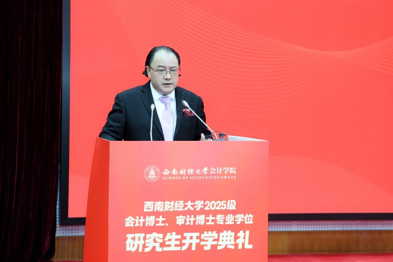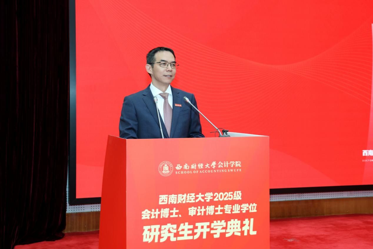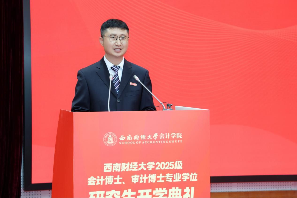 徐登义作为学员单位代表致辞。他深情回顾在西财求学的经历,指出会计审计是守护市场经济秩序、保障国家金融安全的重要支柱,勉励同学们深耕专业、拓展视野,以专业报国践行西财人的初心与担当。