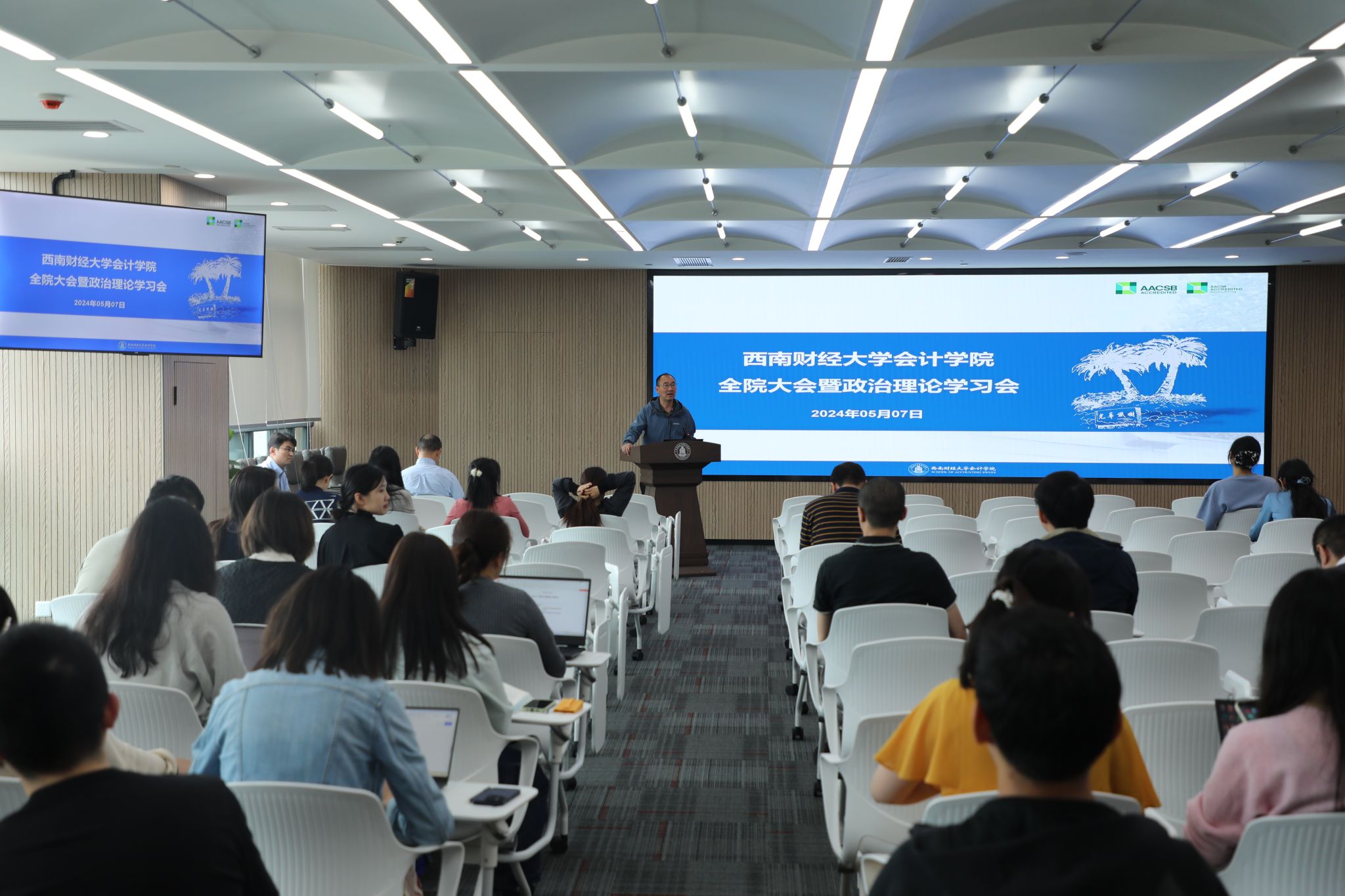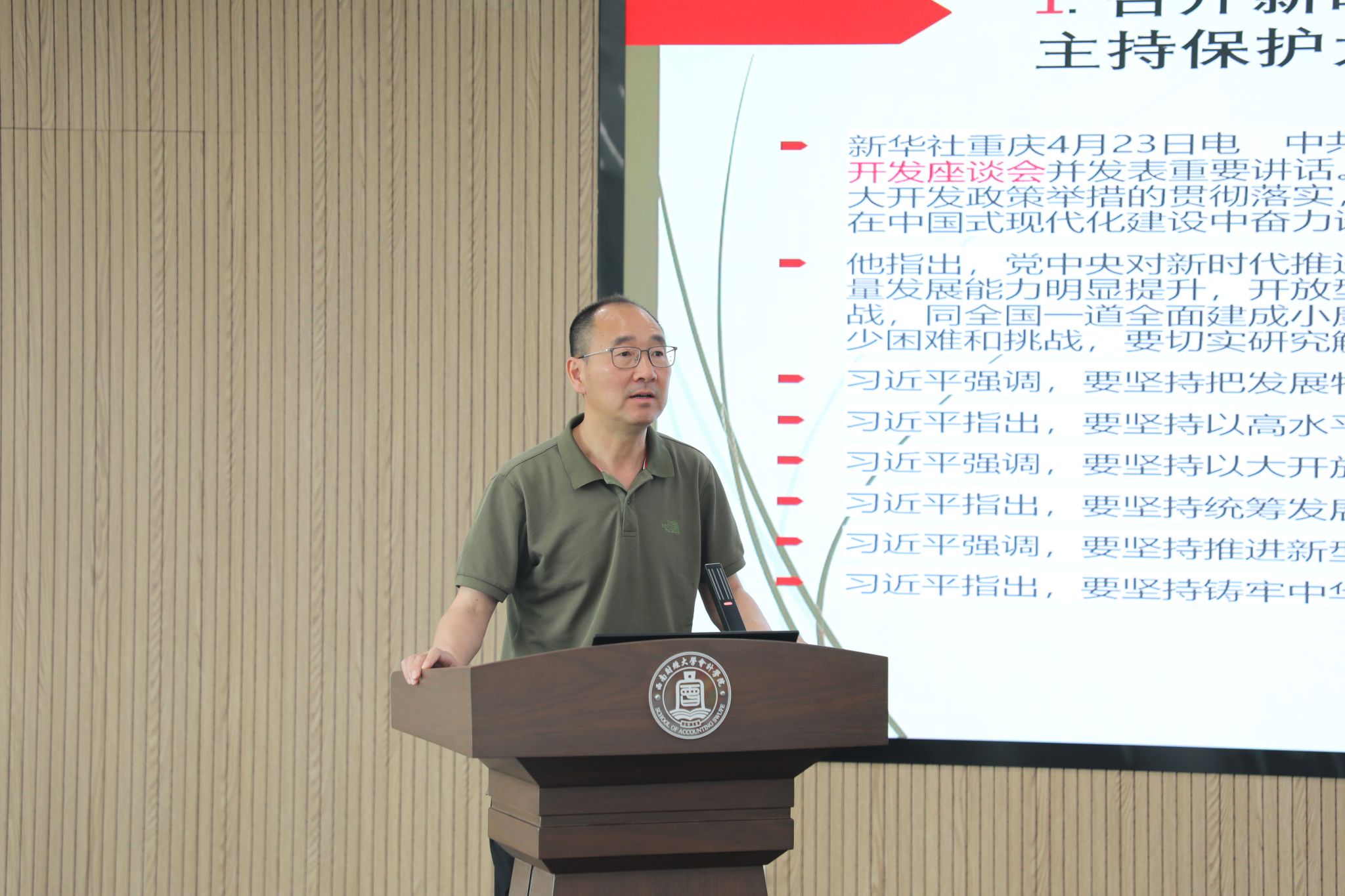 在传达学习习近平总书记在新时代推动西部大开发座谈会上、在重庆考察时的重要讲话精神时,他要求教师深刻领会习近平总书记关于新时代西部大开发的新部署,以实际行动奋力谱写西部大开发西财会计篇章。在导学《求是》杂志发表的习近平总书记重要文章《加强文化遗产保护传承弘扬中华优秀传统文化》《组织动员亿万职工积极投身强国建设、民族复兴的伟大事业》时,他强调,作为教育工作者,要始终坚持以人民为中心的发展思想,全面贯彻党的教育方针,落实立德树人根本任务,传承劳模精神、劳动精神、工匠精神,为培养德智体美劳全面发展的社会主义建设者和接班人而不懈奋斗。