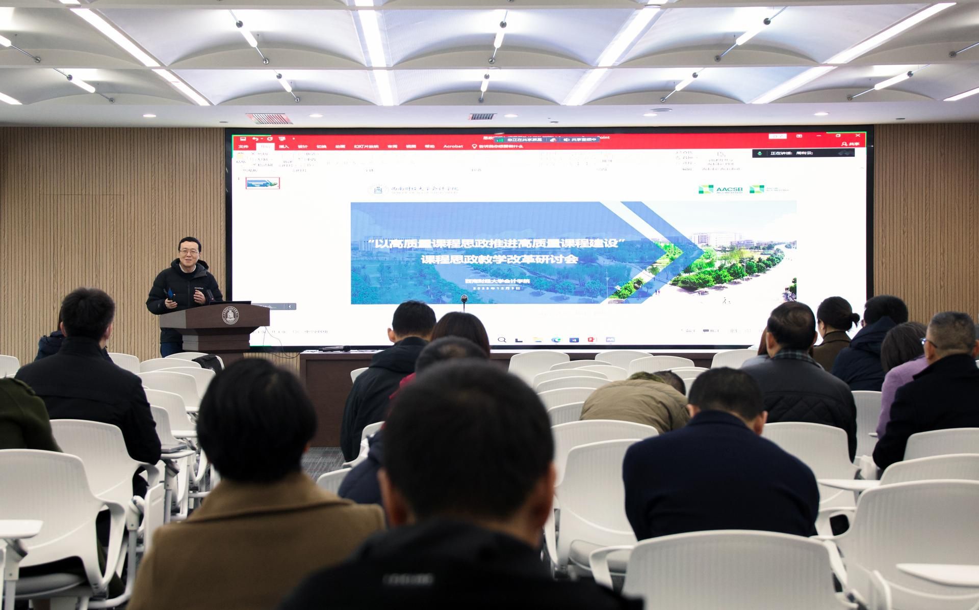 教务处副处长廖春华老师对课程思政的整体要求进行了系统论述,同时肯定了公司老师立足中国实际、发挥财经特色、发挥育人功能的课程思政成果。她强调,做好课程思政要全员、全课程通过多途径、多形式把知识传授融入信念层面。