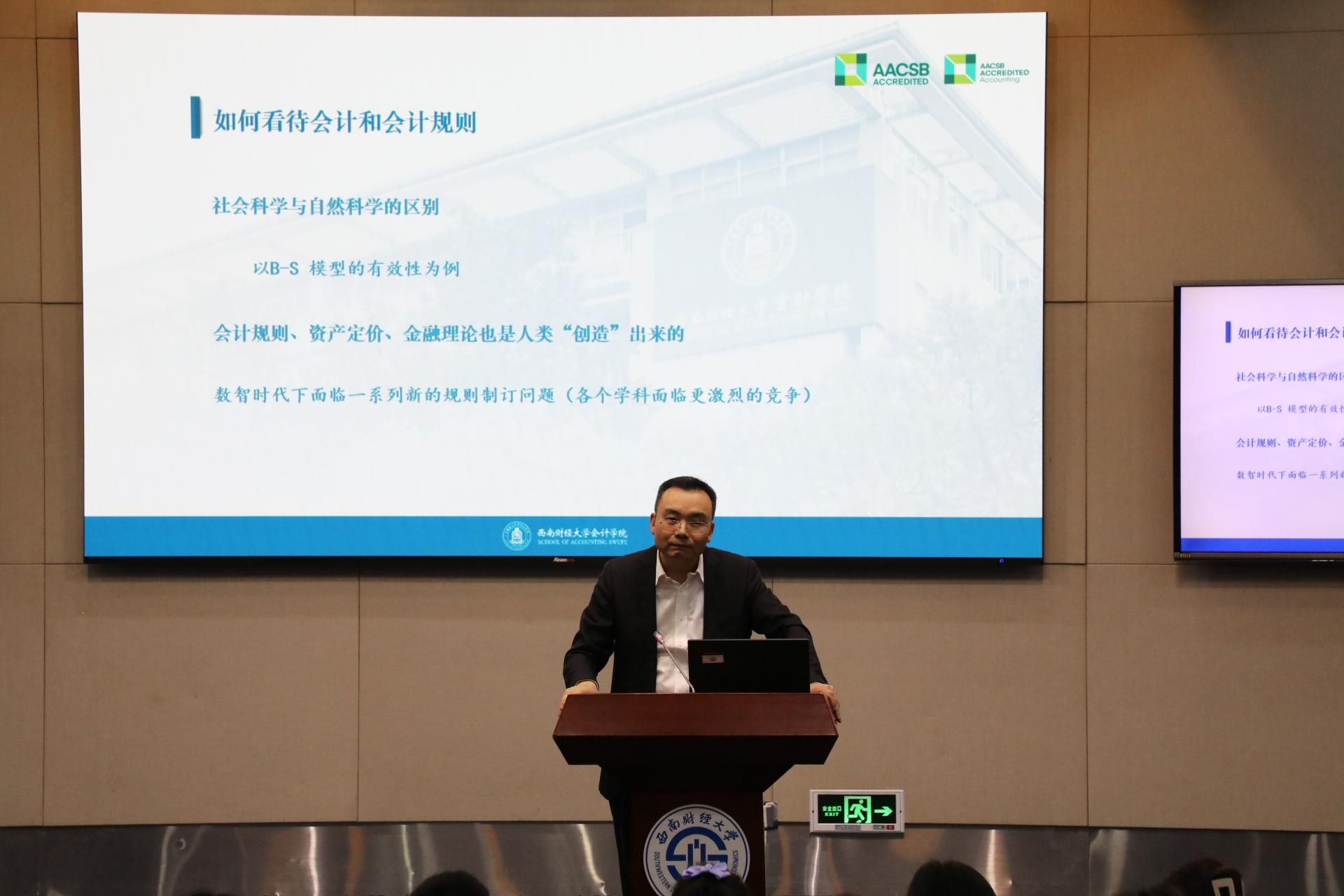 马永强从党的二十大报告中关于经济发展的几个关键词出发,聚焦“数智时代会计如何助力经济高质量发展”的主题,从会计对经济发展的重要性、会计促进经济高质量发展的路径、数智时代会计学科的未来发展等方面展开讲授。马永强由社会科学与自然科学的区别引出“会计规则、资产定价、金融理论是由人类‘创造’出来的”,进而描述了会计信息的3个固有缺陷:历史成本原则使得资产负债表可信度降低、权责发生制原则使得利润表可信度降低、货币计量假设限制会计能力范围。马永强结合实例说明了“会计信息具有经济后果”,从而阐明会计之于经济社会的重要性,“经济越发展,会计越重要;技术越进步,会计越发展”。