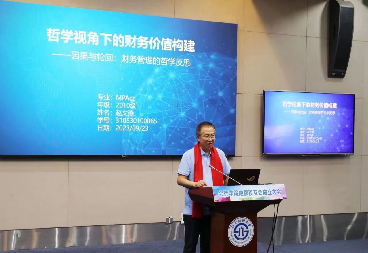 金秋九月,相聚柳林,员工重逢,共谋发展。2023年9月23日下午,以成都员工会的正式成立为契机,“西财会计员工讲坛·第十八场”在柳林校区弘远楼101会议室成功举办。本次员工讲坛邀请到了2010级会计硕士员工赵文燕、2007级博士员工逯东分别作了“哲学视角下的财务价值构建”、“财务与会计的未来发展思考”的主题演讲。论坛由K1体育副经理唐雪松主持。